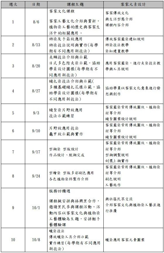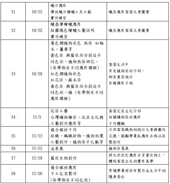 課程中除了專業的染織工藝課程外,更會帶入客家文化與意涵的介紹,鼓勵學員運用客家傳統意象與現代設計思維進行植物染創作,擷取具有客家精神價值的文化特質,透過現代審美觀點的轉化,創造出創意與傳統價值兼具的客家文化產品。