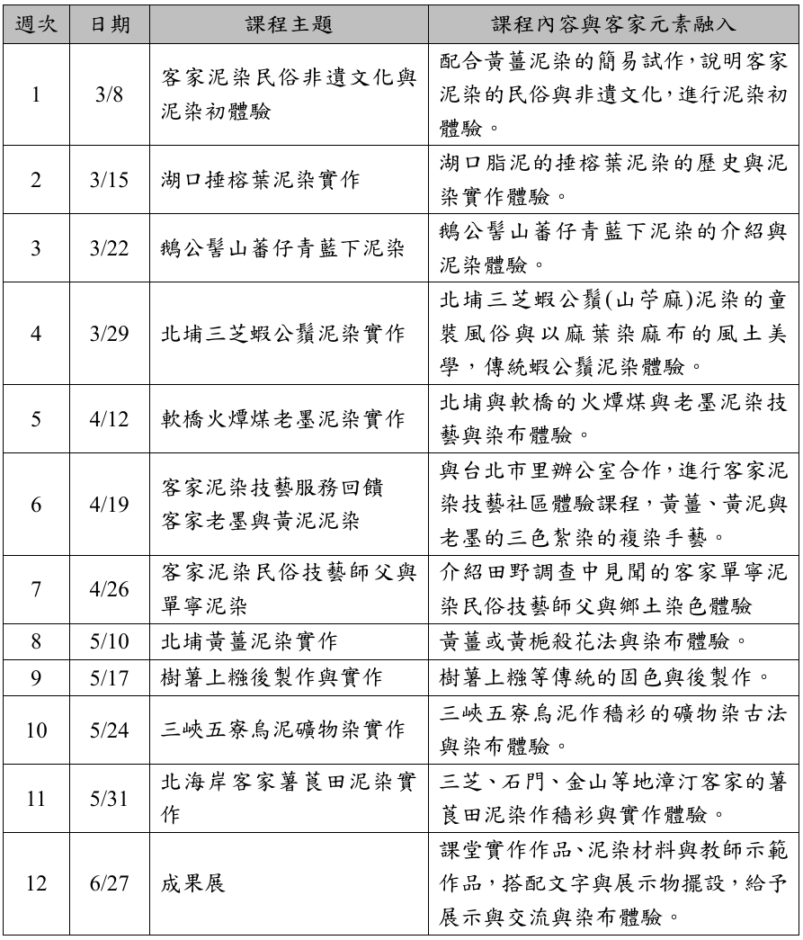 課程主題主要包括湖口捶榕葉泥染實作、鵝公髻山蕃仔青藍下泥染、北埔三芝蝦公鬚泥染實作、軟橋火燂煤老墨泥染實作、北埔黃薑泥染實作、三峽五寮烏泥礦物染實作、北海岸客家薯莨田泥染實作等課程。