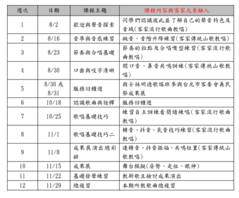 用簡譜的客家歌曲搭配電子琴教唱,調性會隨個人音質音高調整,讓學員找到最適合自己的調性,唱出最舒適的歌聲。